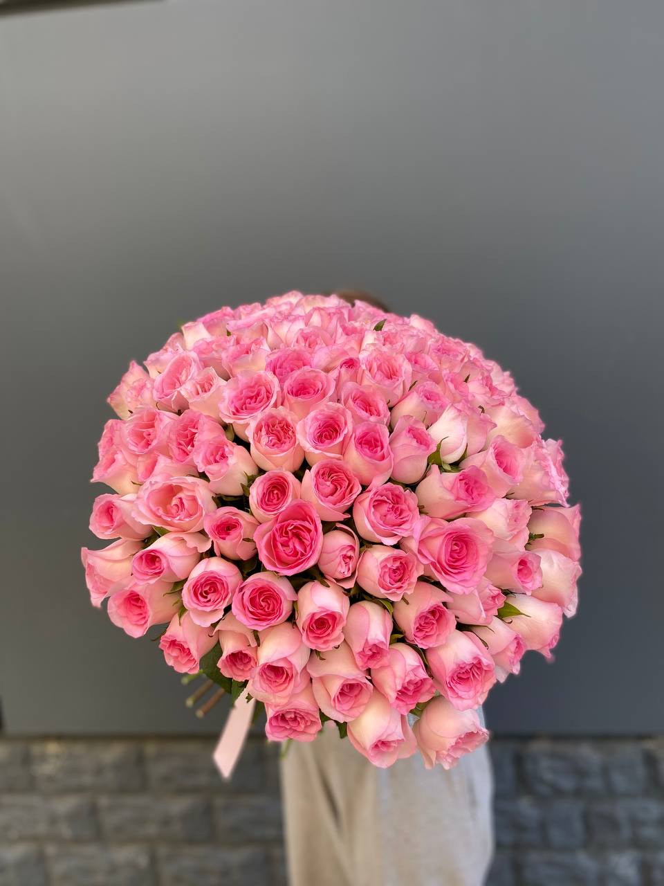 Розовые бутоны собраны в свободную форму с мягкими переходами по высоте. Лепестки играют оттенками от пудры до персика и создают живую подвижную текстуру.