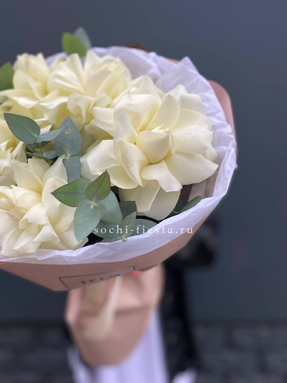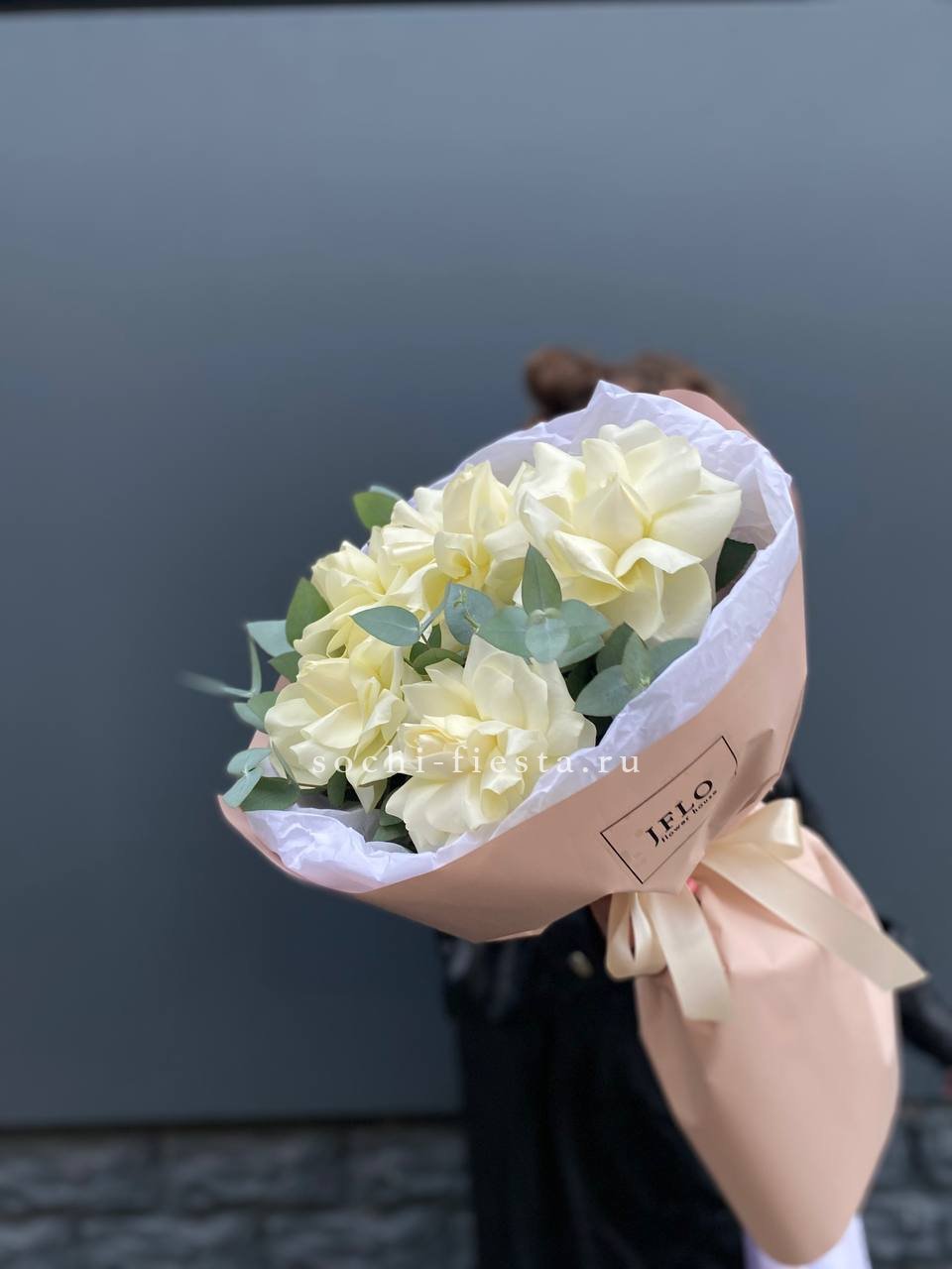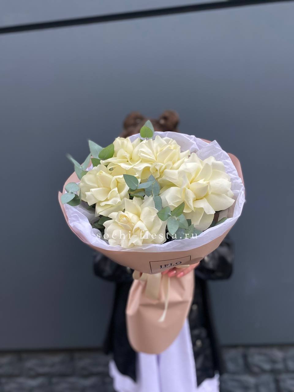 Состав букета на фотографии: вывернутые розы - 5 шт., эвкалипт - 2шт., лента, авторская упаковка