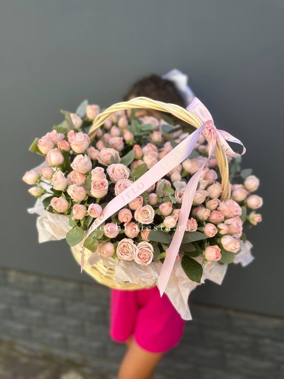 Состав: 35 пионовидных кустовых роз , эвкалипт, светлая корзина.