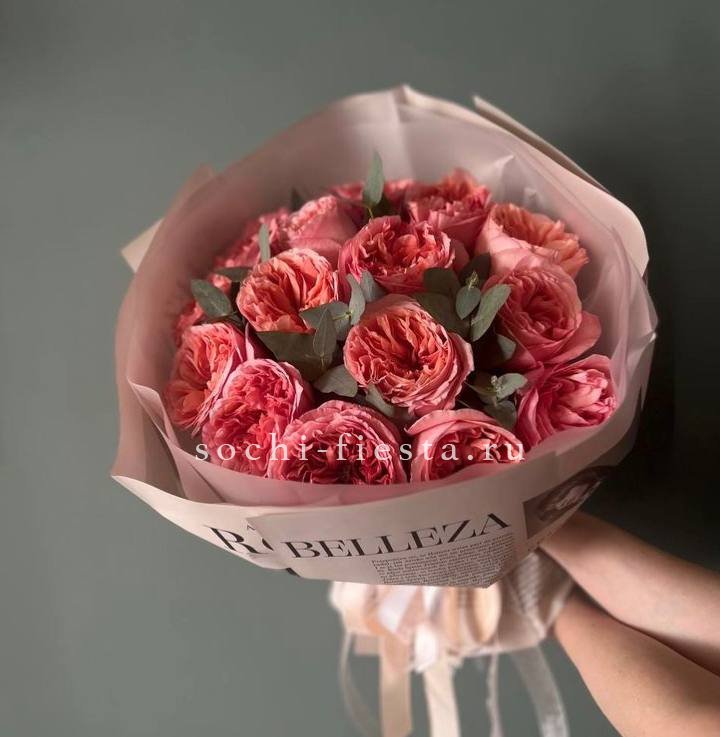 Состав: розы пионовидные 15 шт, эвкалипт, пленка, лента