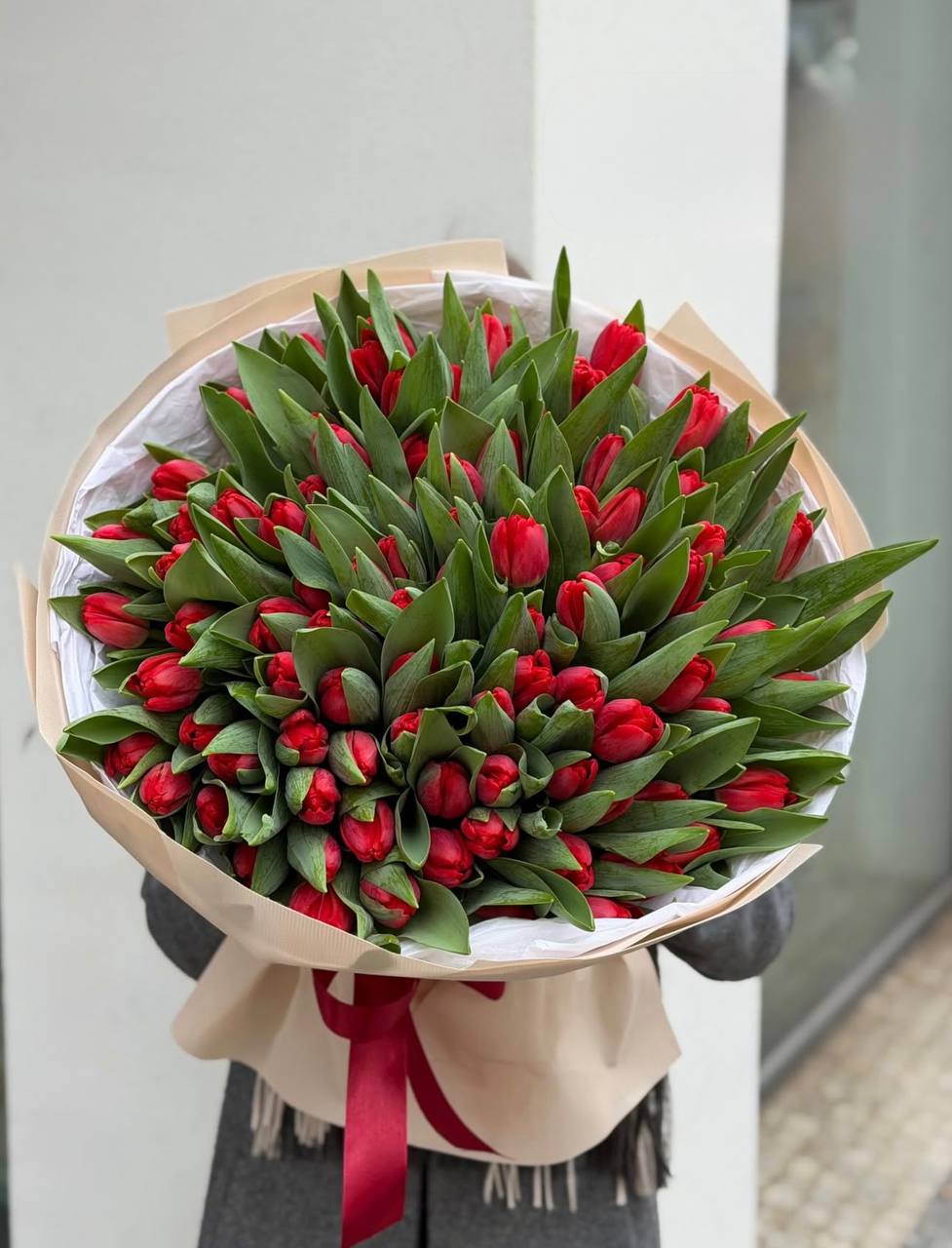 Двадцать пять пионовидных тюльпанов в лаконичной двухцветной обёртке. Белые бутоны с густыми лепестками держат форму и радуют свежестью несколько дней подряд.